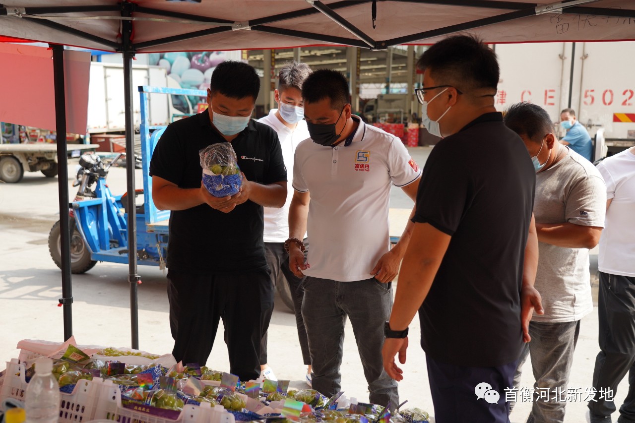 8月5日,繼順平蘋果對接后,徐水葡萄產(chǎn)銷對接活動順利落實。保定市徐水區(qū)農(nóng)業(yè)局帶隊,徐水劉伶田園小鎮(zhèn)總裁助理王森一行到高碑店市場葡萄專區(qū)就市場行情、在售品種、銷售渠道進行深入了解,并就葡萄種植、采摘、存儲等相關(guān)問題與場內(nèi)商戶展開深入交流。
